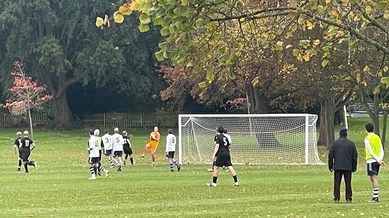 But here, under leaden skies on a cool autumnal morning on the Hill, the visitors ensured there would be no repeat of a slow start and they matched the home side all the way, stride for stride to the interval. The result was a tight, tense first half, almost completely devoid of goalmouth incident – a rarity for any OHAFC fixture. A couple of long range efforts from both sides failed to test the respective keepers, the hosts finding themselves under real pressure for a good twenty-five minutes but relying, once more against these opponents, on the disciplined and determined defending of the back five – boosted by the late availability of the towering Alexi Pittalis. Leading scorer Andy Hutchinson came closest to breaking the deadlock when he was tripped on the edge of the box but, having picked himself up, was allowed to continue by the referee and, having driven past another defender, fired his shot just wide of the far post.
