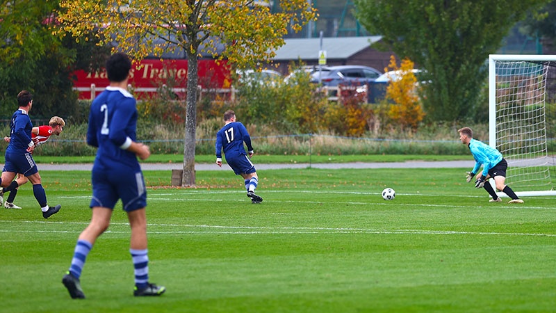 The hosts had clearly been given a talking to during the interval as they came out a different side. Pressing high up the pitch, the men in blue were almost immediately under intense pressure and for twenty minutes the Harrow goal led a charmed life. Only a combination of alert keeping from Rory Craig and desperate defensive work from the back five ensured the much-desired clean sheet remained in tact. Several times Craig saved goalbound efforts only for the ball to run loose inside the six yard box causing frantic blue shirted players to fling themselves in the way. Each time, however, a Harrovian boot had the final word and it became abundantly clear why the hosts have only scored twice so far this season.