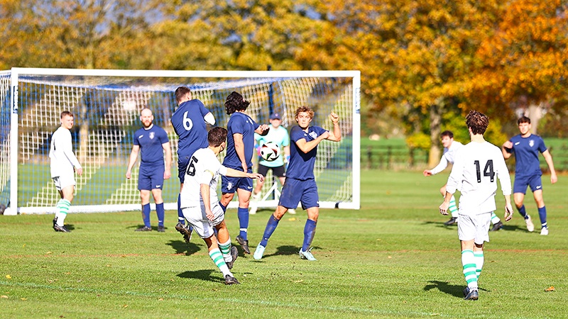 Conditions in the Midlands were close to perfect with bright sunshine, a gentle breeze and the single football pitch among a sea of rugby fields in good condition. The only slight anomaly was the lines being painted red instead of white – something colour blind keeper Tom Mitchell was not particularly enthused about. Nevertheless, the Harrow number one was quickly called upon to make a smart early save with his right boot, the Rugbeians sliding a ball down the inside right channel and the low shot that followed was destined for the bottom corner until Mitchell’s crucial intervention. The visitors then broke upfield and had the ball in the net only for the referee to rule out George Taylor’s strike for what appeared a fairly clear offside. Barring these two isolated chances, the opening fifteen minutes proved fairly scrappy, the spectacle enlivened slightly for those watching on from the side by the presence of ITV Sport front man Mark Pougatch – in attendance to cheer on son Sam, the Rugby skipper.