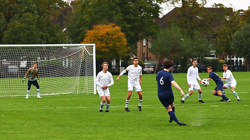 The Rugbeians cleared that danger, but five minutes later found themselves deservedly trailing to a wonderful Harrow goal. A flowing move started on the edge of their own penalty area and involved most of the side, Walduck’s dummy fooled the pressing forwards and the Blues were away, Keeble feeding Koutalides down the right. The winger played a first-time ball into the six-yard box where Mahal had timed his run to perfection, sweeping home at the near post to spark jubilant celebrations.